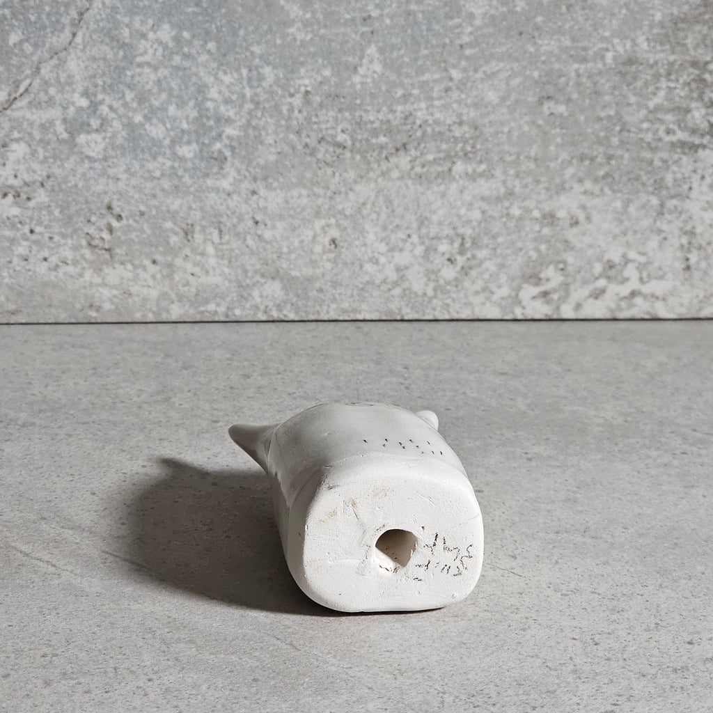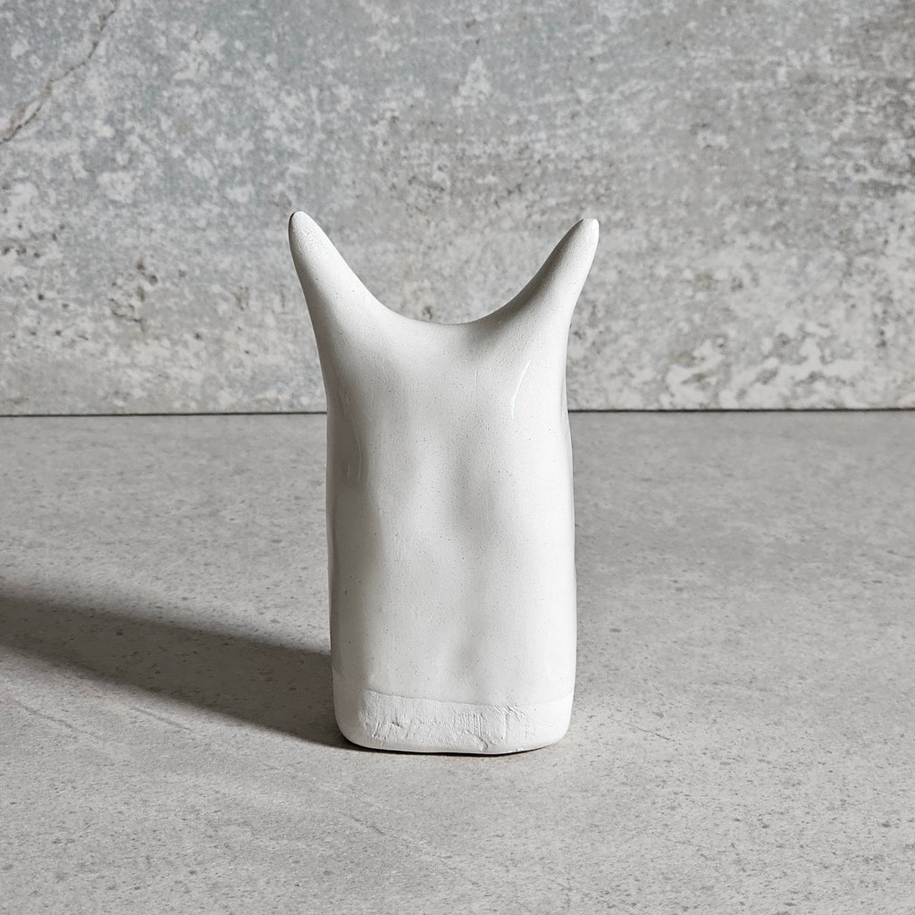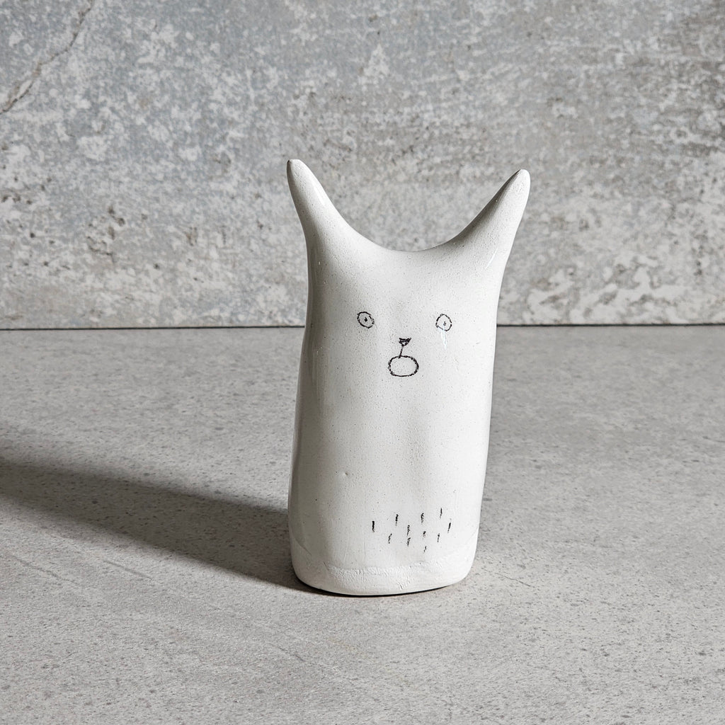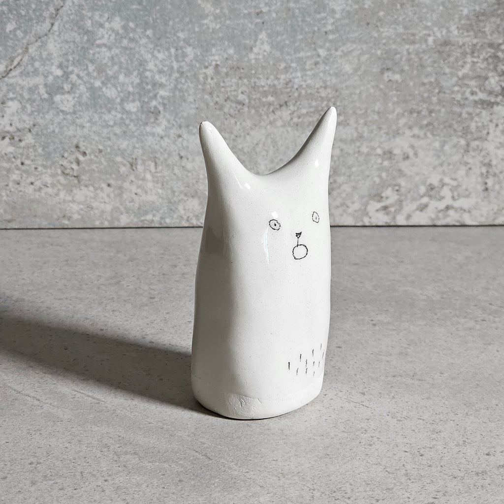 Scultura realizzata in ceramica bianca, decorata e vetrificata con smalto trasparente.
