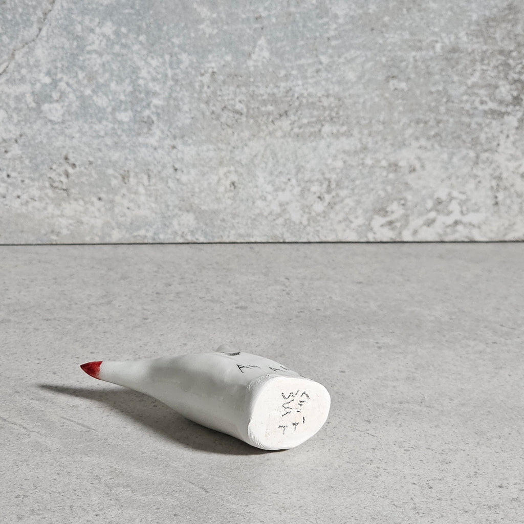 Scultura realizzata in ceramica bianca, decorata e vetrificata con smalto trasparente.