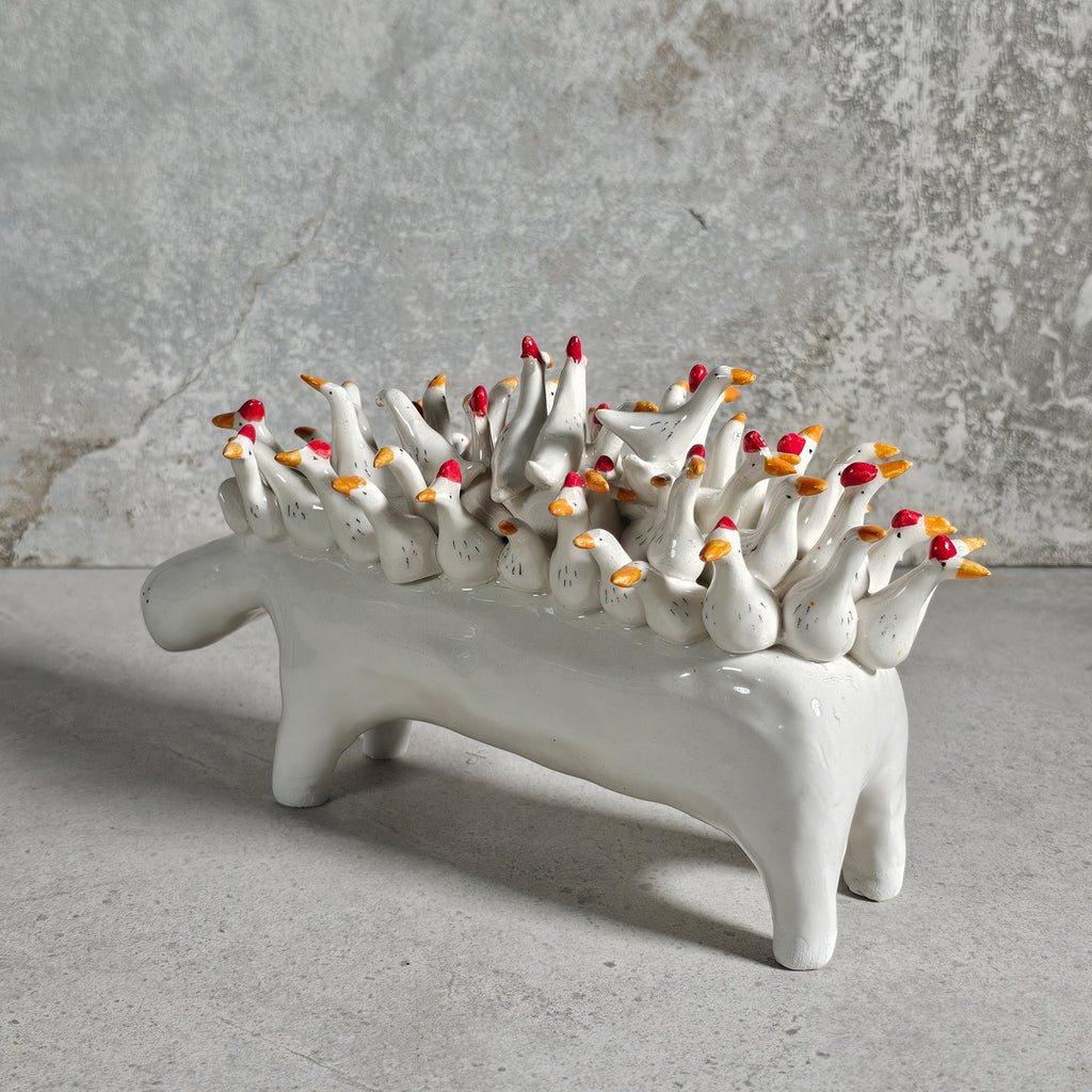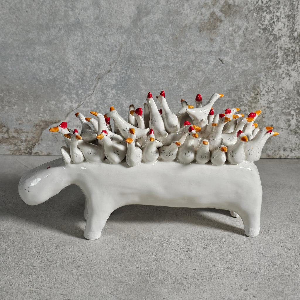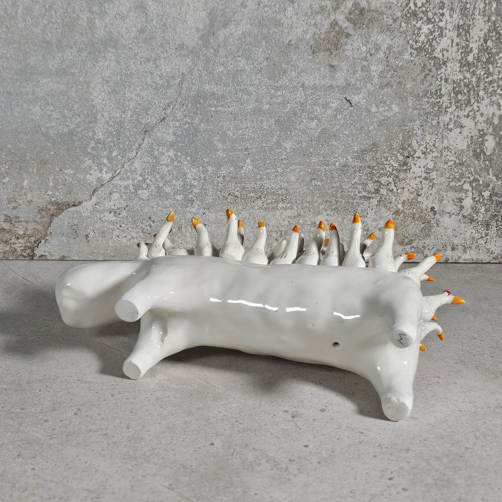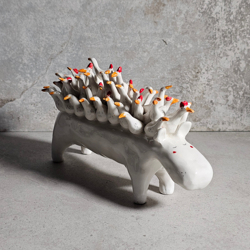 Scultura realizzata in ceramica bianca, decorata e vetrificata con smalto trasparente.