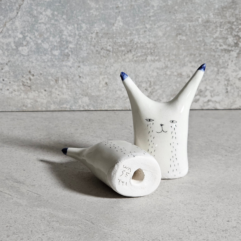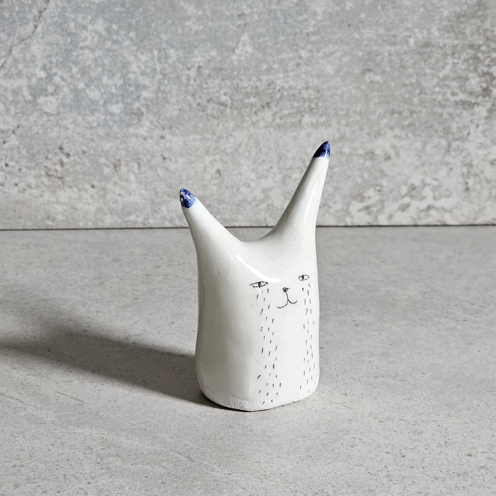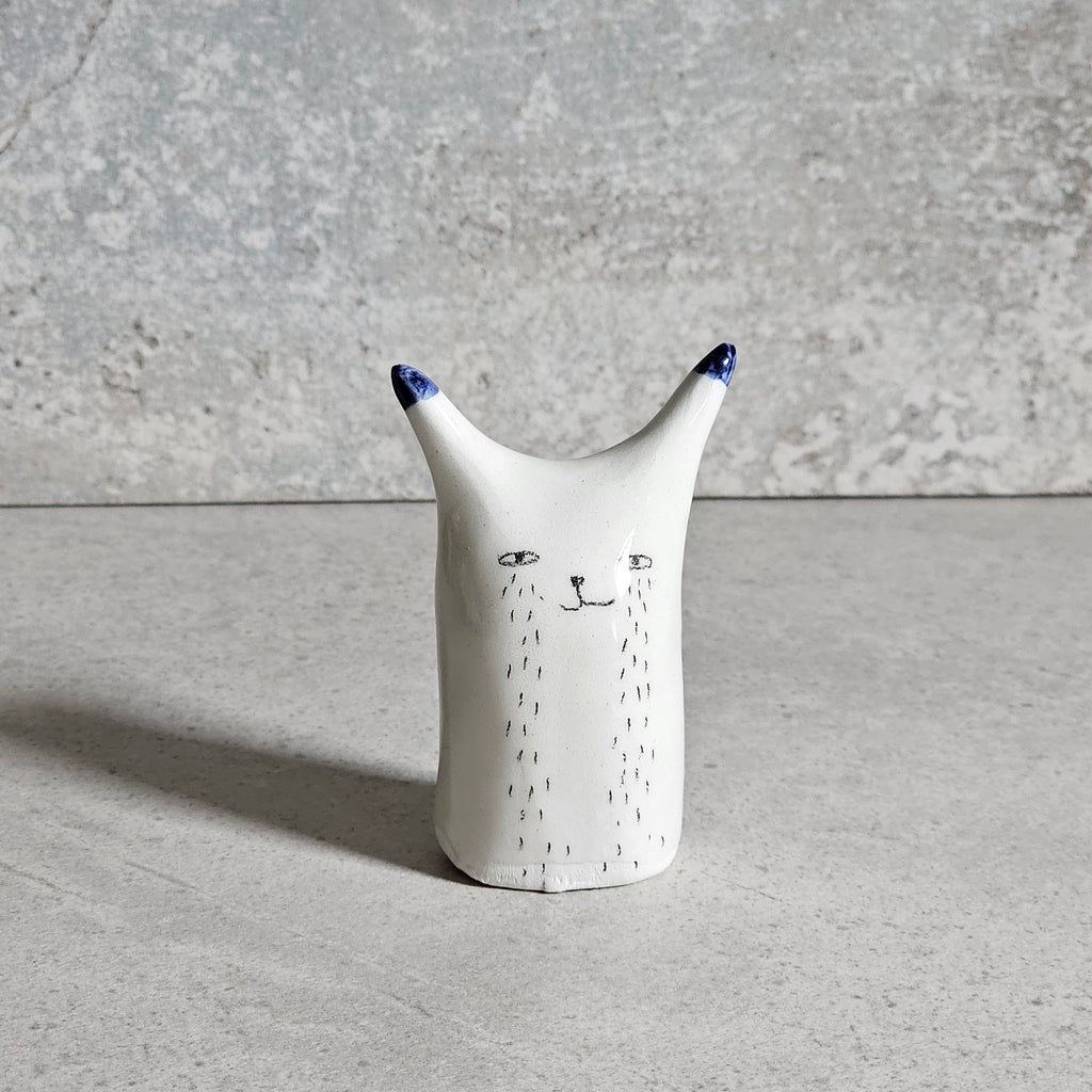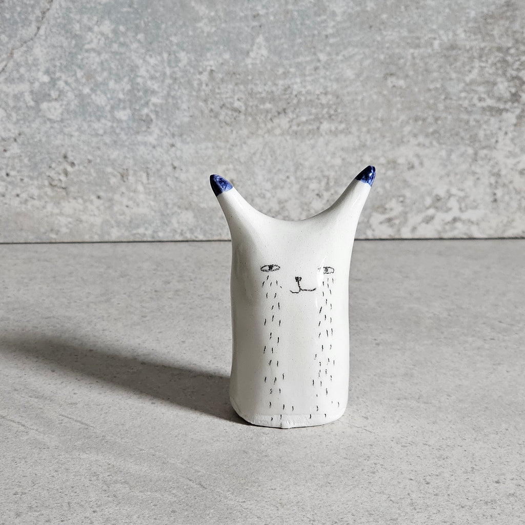 Scultura realizzata in ceramica bianca, decorata e vetrificata con smalto trasparente.