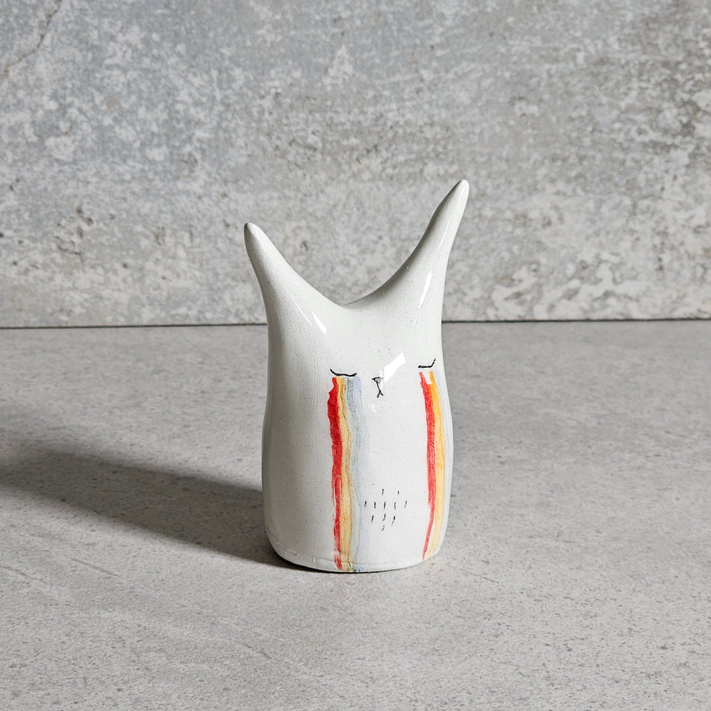 Scultura realizzata in ceramica bianca, decorata e vetrificata con smalto trasparente.