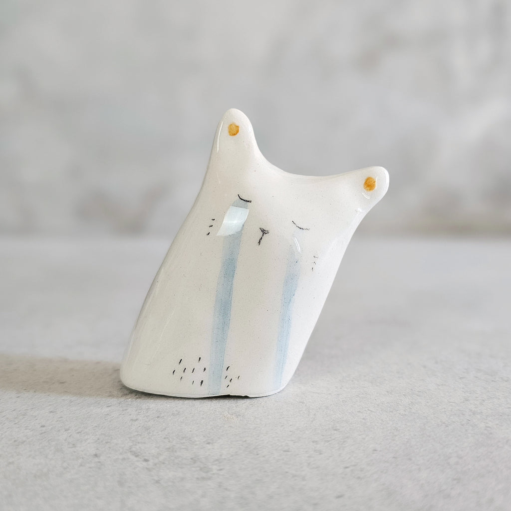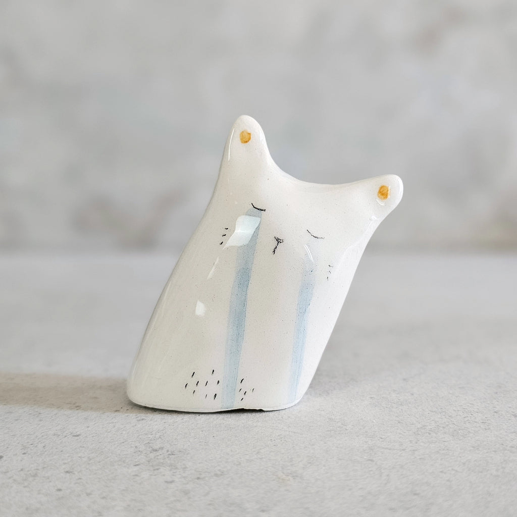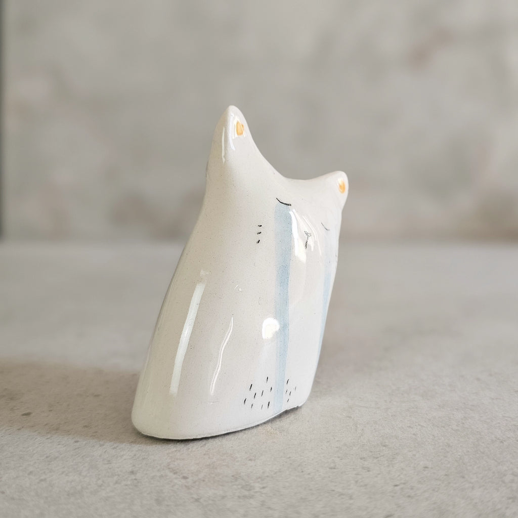 Scultura realizzata in ceramica bianca, decorata e vetrificata con smalto trasparente.