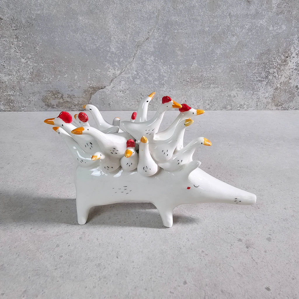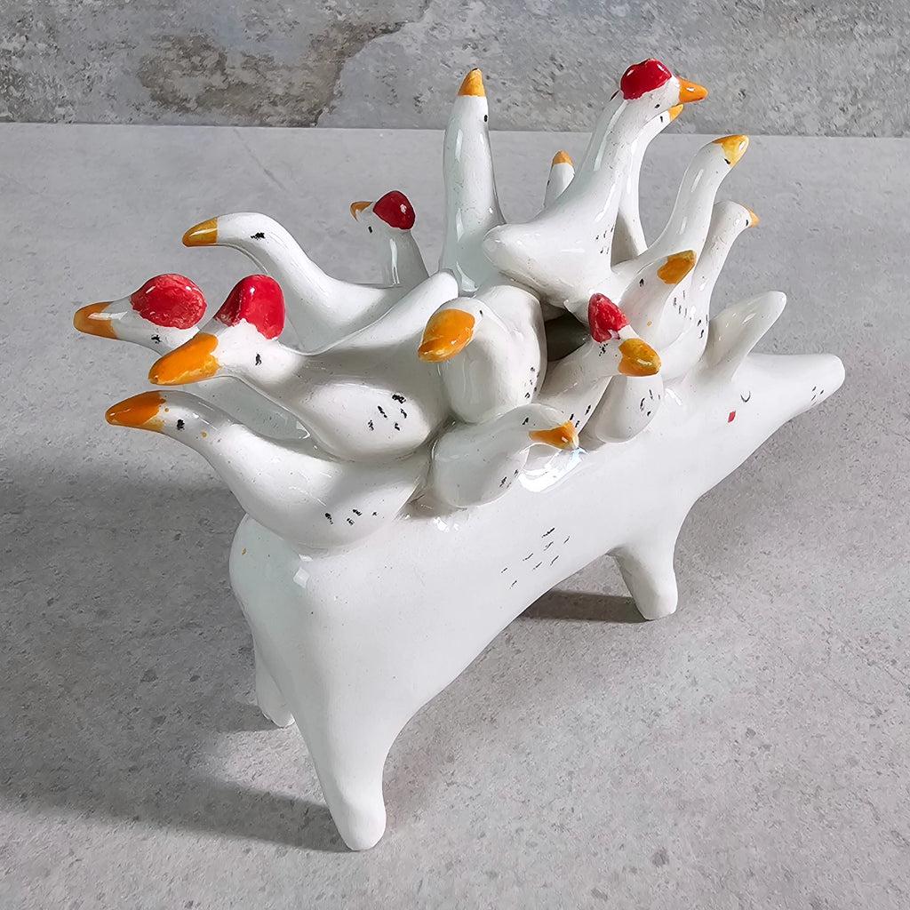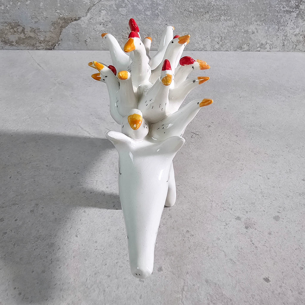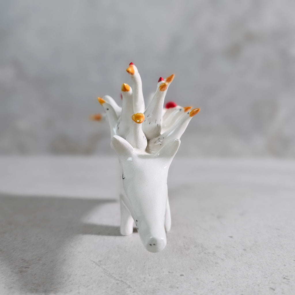 Sculpture made of white ceramic, decorated and glazed with transparent enamel.