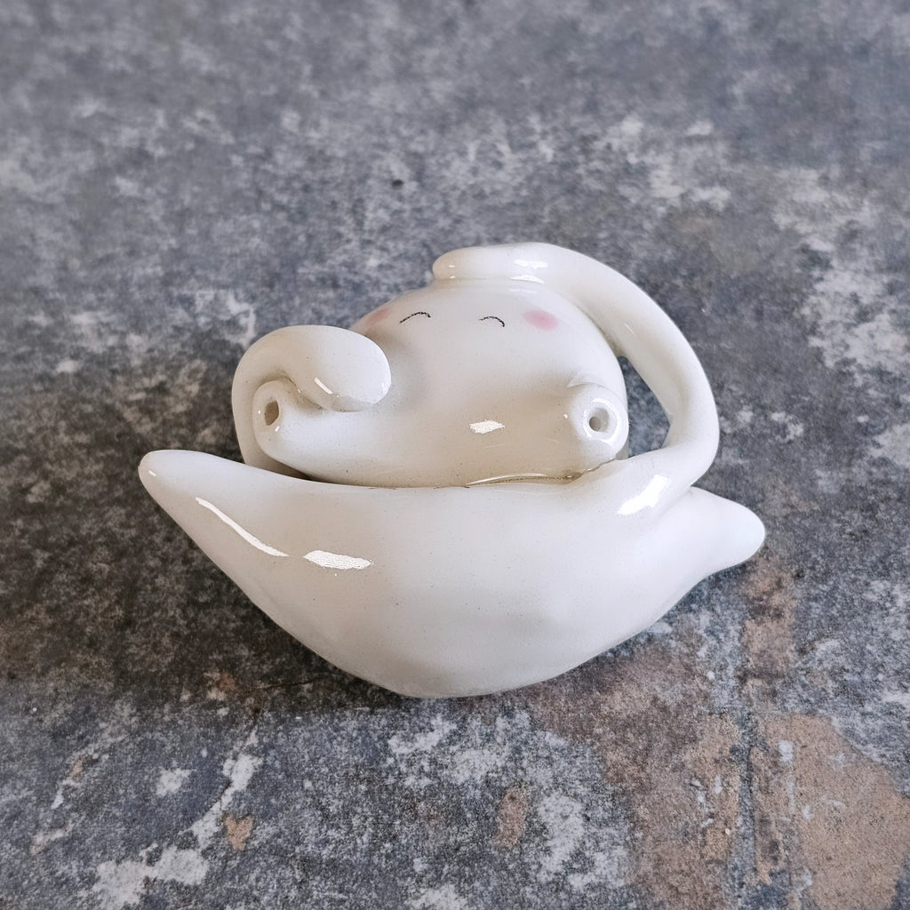 Made of white ceramic, decorated and glazed with transparent enamel.