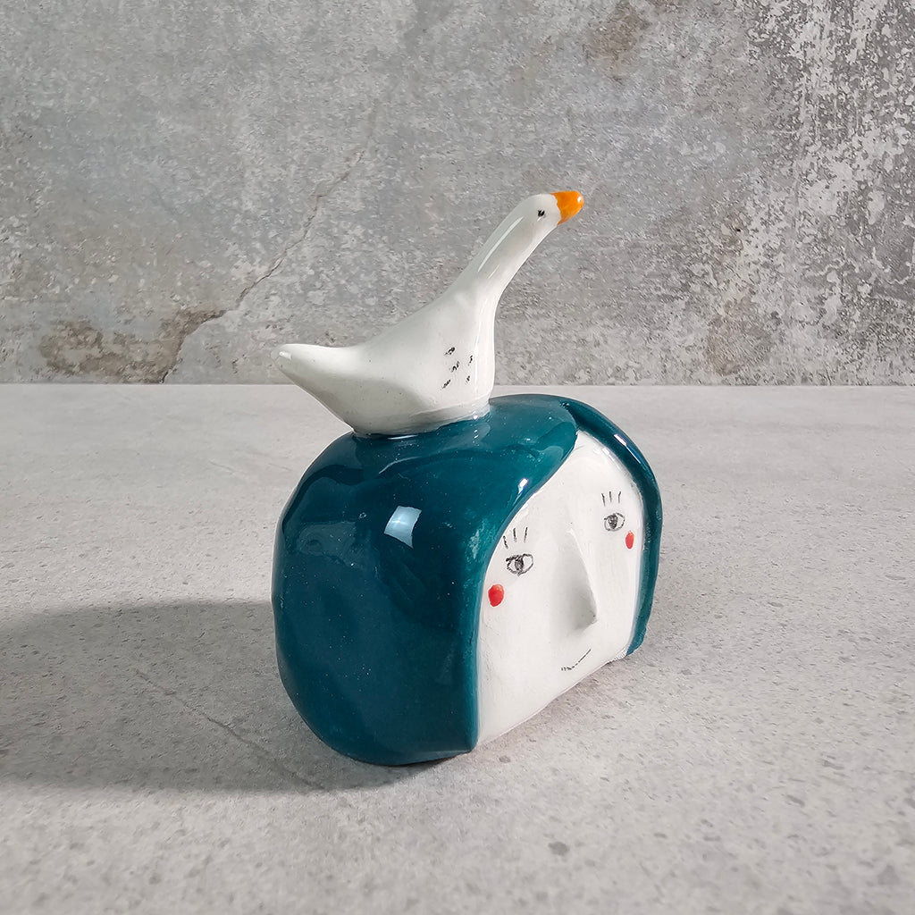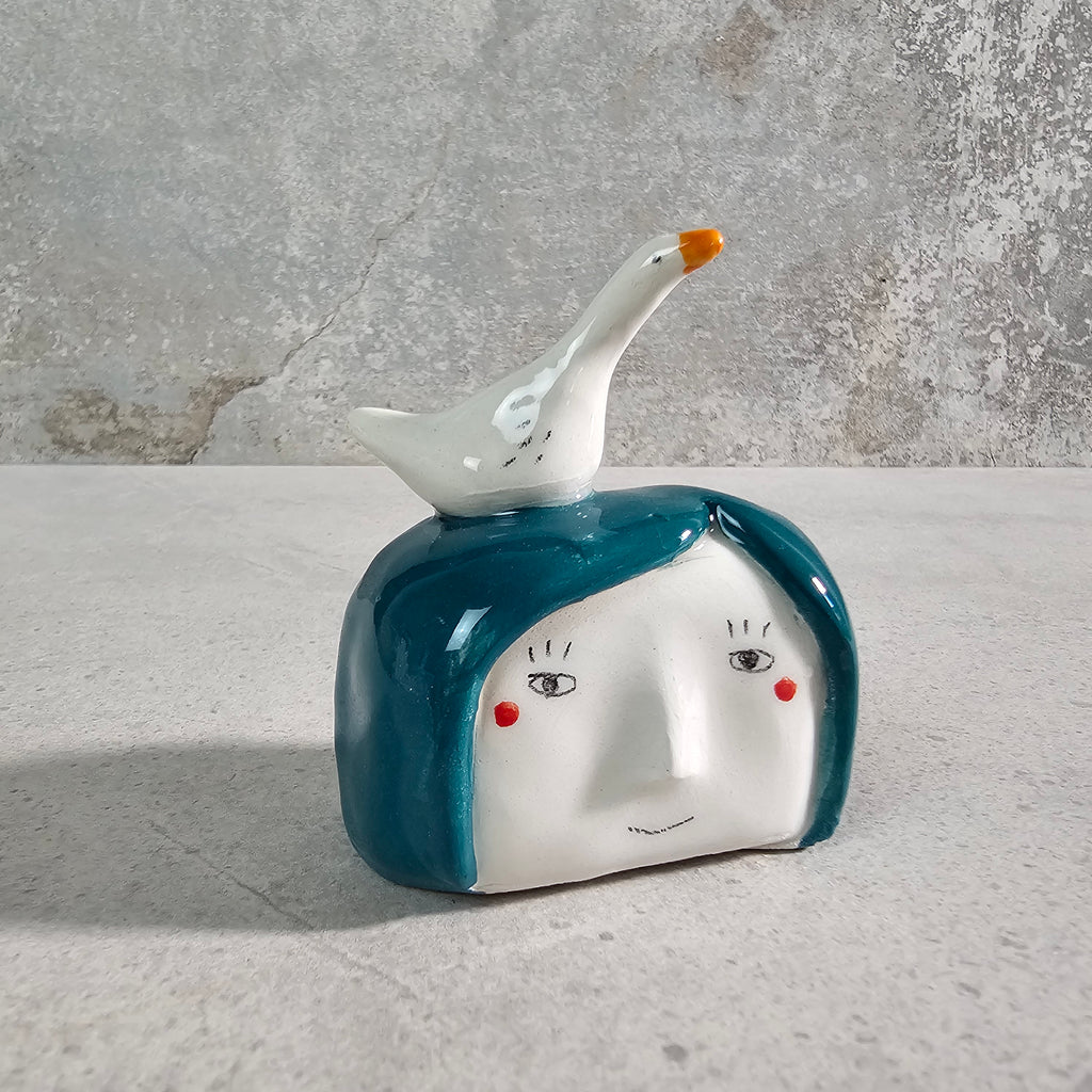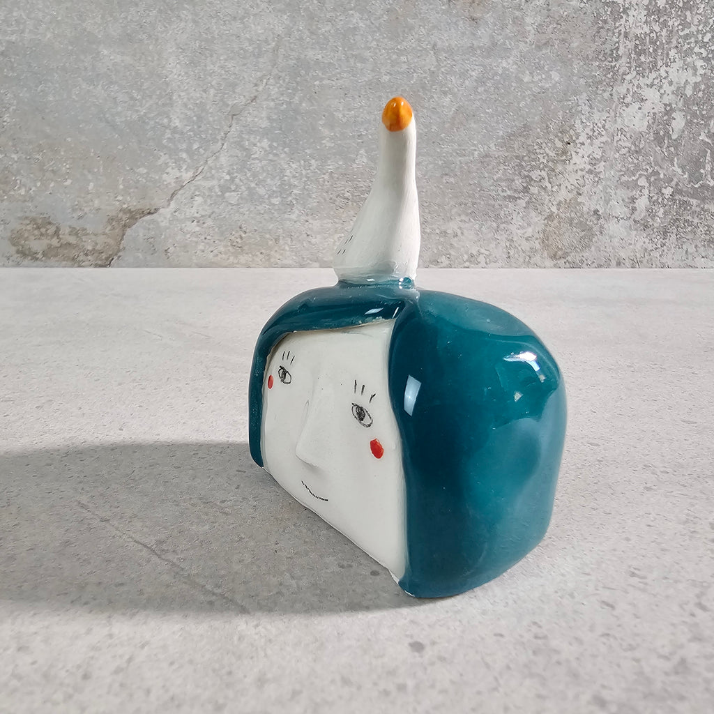 Scultura realizzata in ceramica bianca, decorata e vetrificata con smalto trasparente.