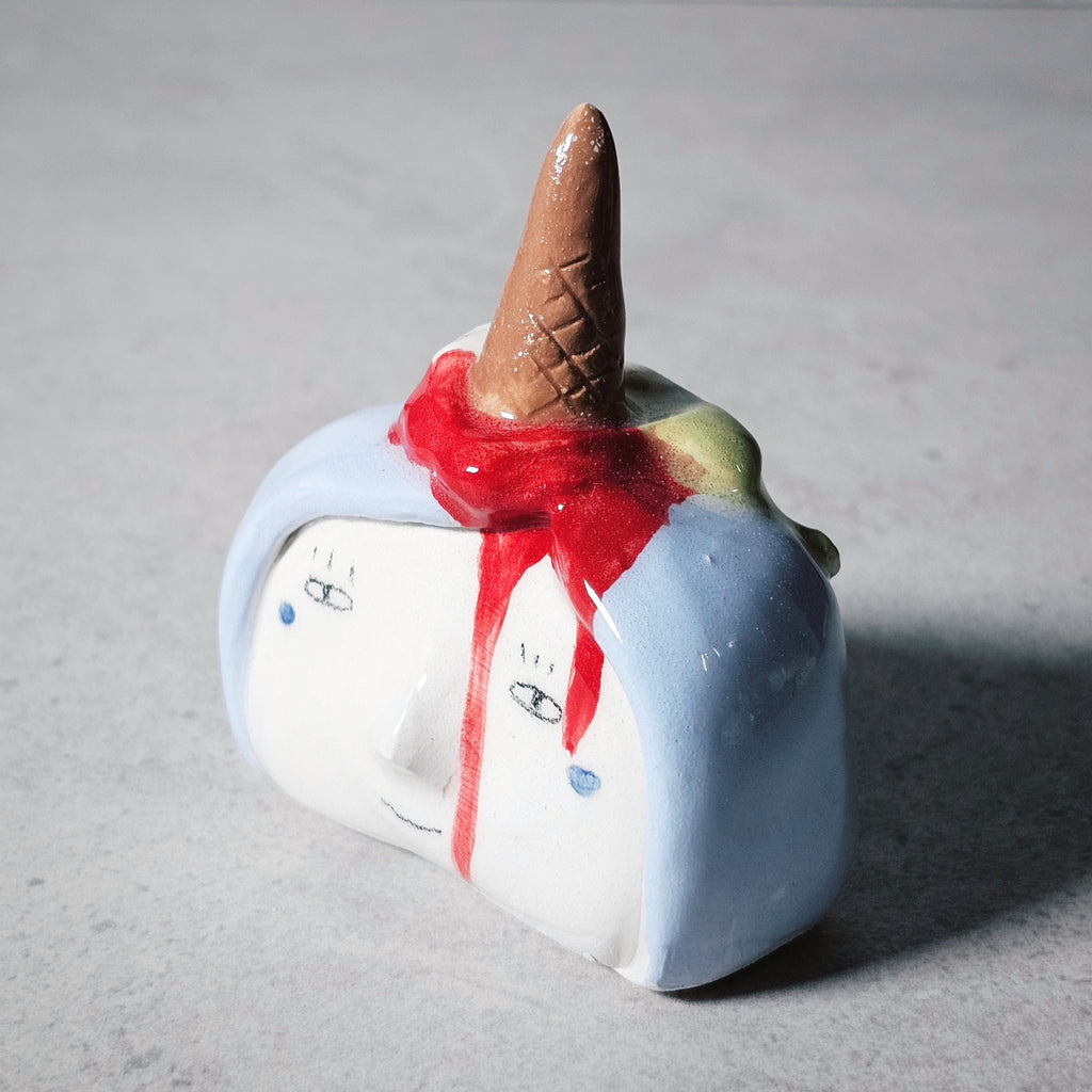 Scultura realizzata in ceramica bianca, decorata e vetrificata con smalto trasparente.